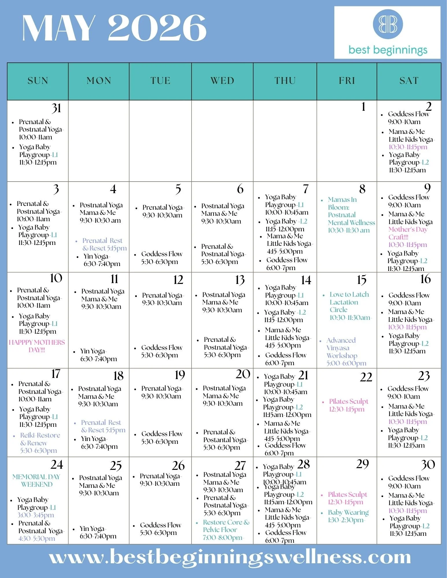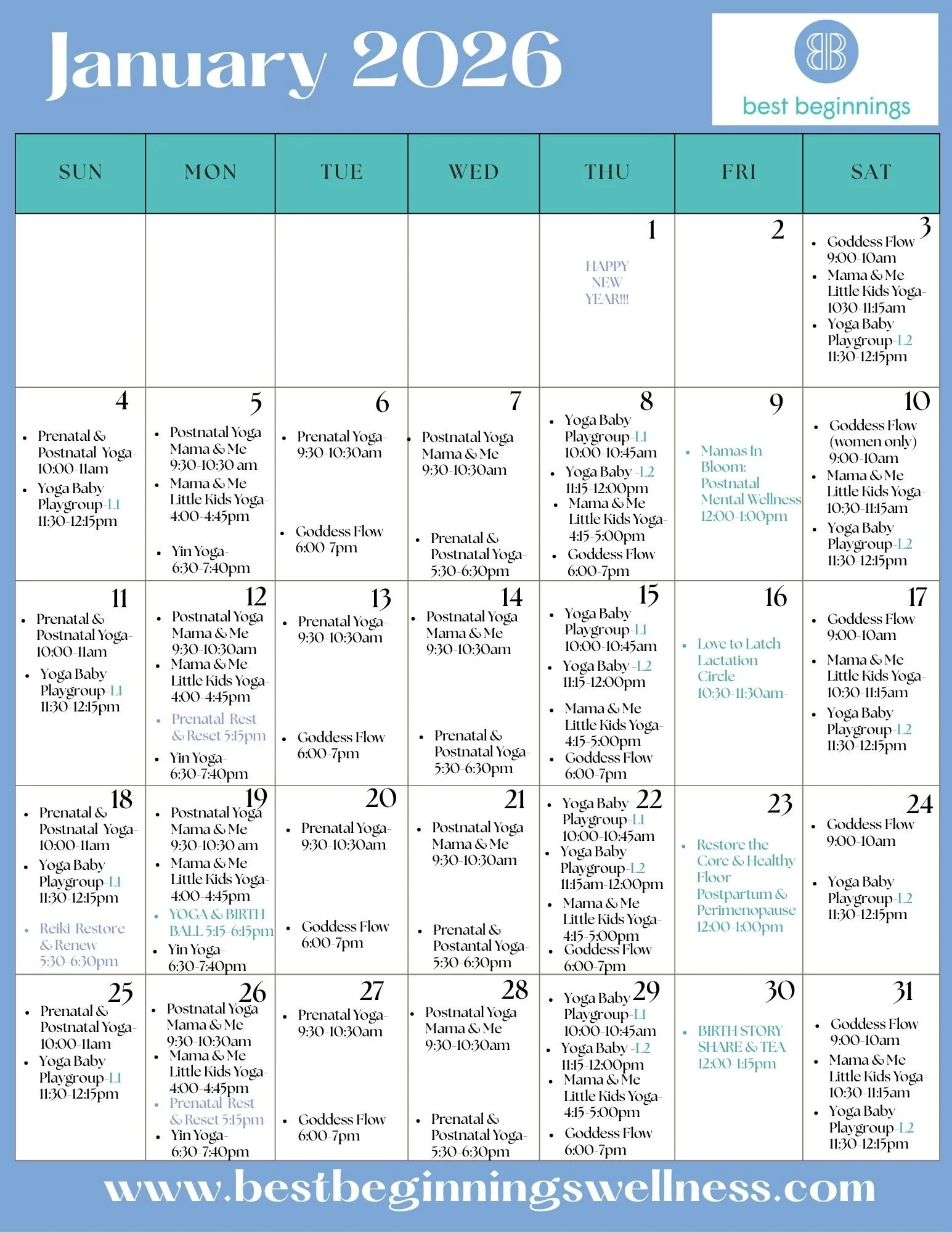 Best beginnings postnatal classes are a great way to ease back into activity. The classes feel tailored to best support and strengthen a recovering body and I love the option to bring and even incorporate my baby into the practice.